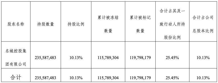 公告显现,名城控股集团有限公司偏执一致活动东说念主讨论捏有公司925,519,761股股份,占公司总股本的39.81%,限度本公告日,名城控股集团有限公司捏有的公司股份被端正冻结115,789,304股、被端正记号119,798,179股,占公司总股本的10.13%。