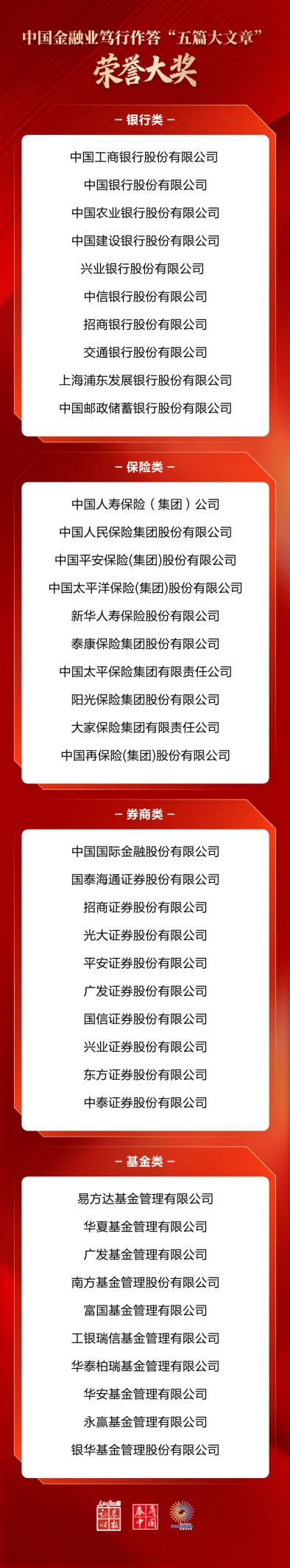 这次“中国金融业笃行作答‘五篇大著作’荣誉大奖”通过客不雅数据、量化目的,评比出银行业、保障业、证券业、基金业作答“五篇大著作”发扬最初的各行业前十机构,并为其颁发该奖项,以此赏赐其所作念探索和辛勤,更旨在鼓动金融机构进一步深化在“五篇大著作”上实践探索与盘算布局。